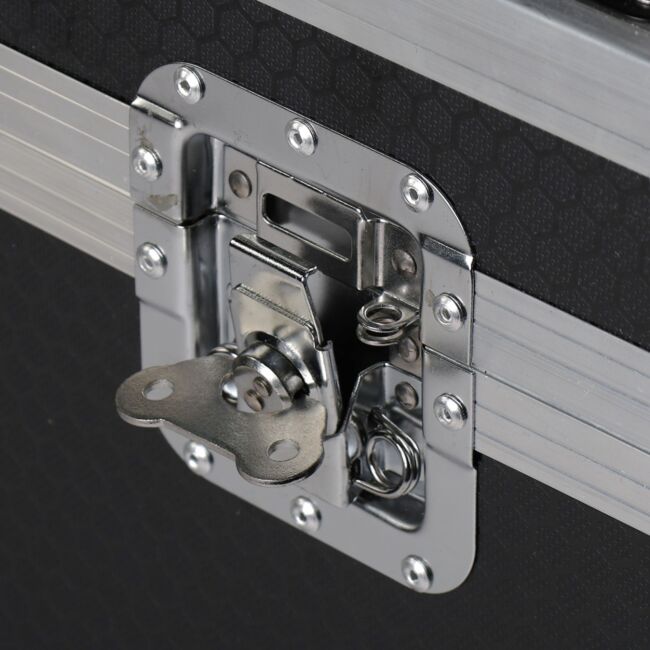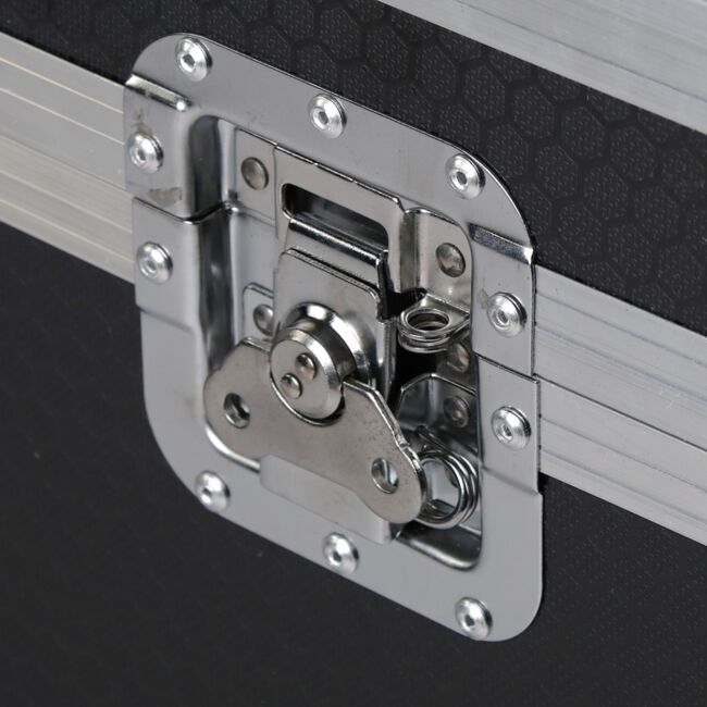 Zamki motylkowe gwarantują pewne i szybkie zamykanie ✴️ Narożne osłony kulowe dodatkowo zabezpieczają skrzynię przed uszkodzeniami podczas częstego załadunku i rozładunku ✨ Czarno-srebrny design doskonale komponuje się z innym sprzętem scenicznym, podkreślając profesjonalny charakter Twojej realizacji.