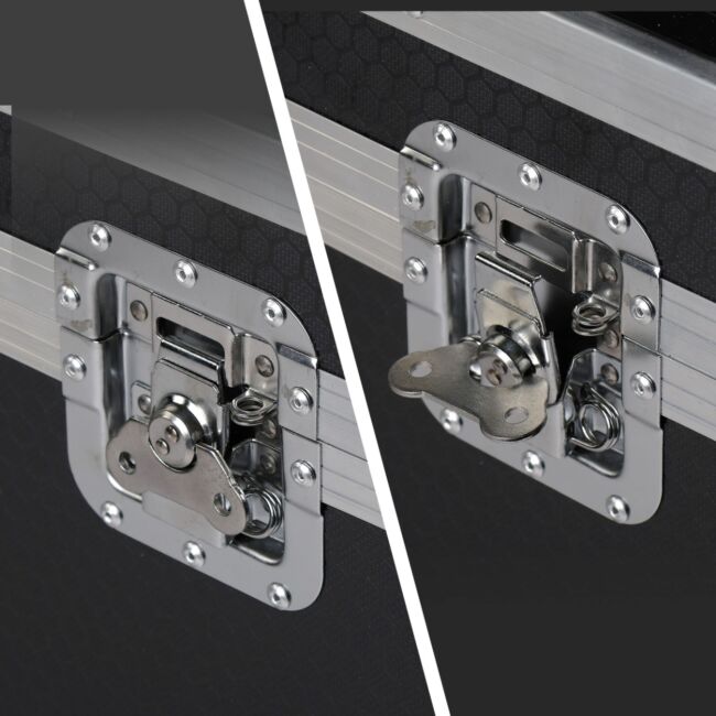 Zamki motylkowe gwarantują pewne i szybkie zamykanie ✴️ Narożne osłony kulowe dodatkowo zabezpieczają skrzynię przed uszkodzeniami podczas częstego załadunku i rozładunku ✨ Czarno-srebrny design doskonale komponuje się z innym sprzętem scenicznym, podkreślając profesjonalny charakter Twojej realizacji