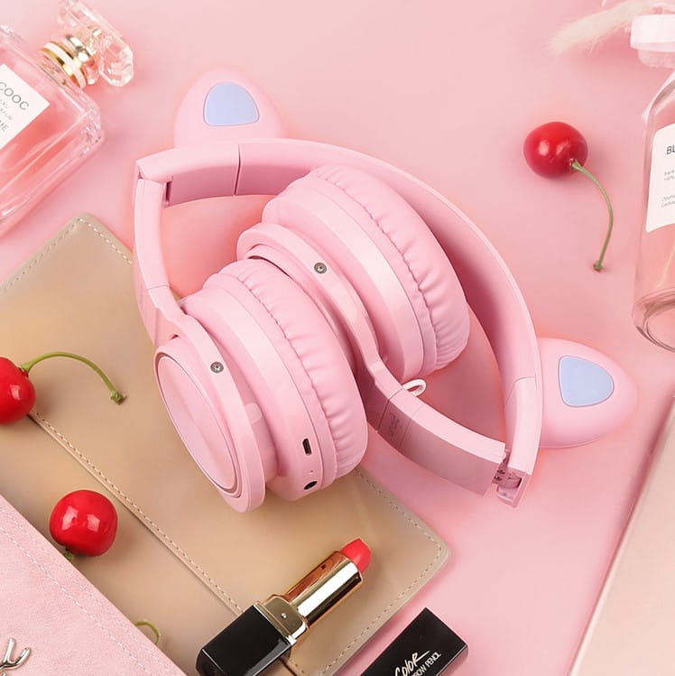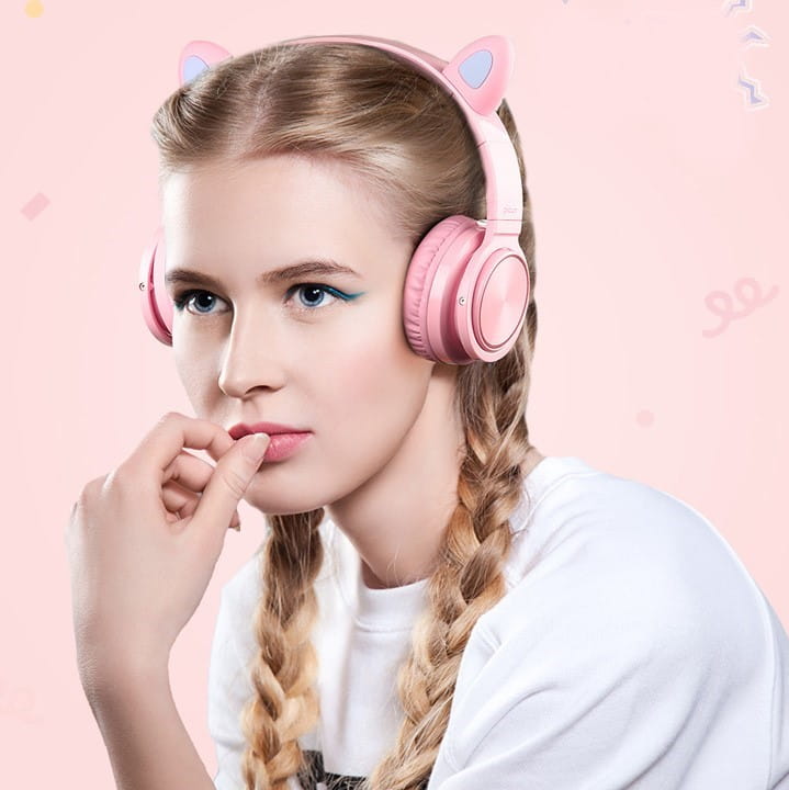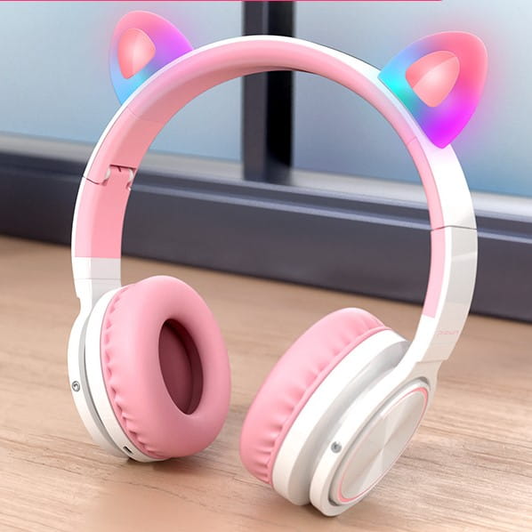 Słuchawki bezprzewodowe Bluetooth 5.0 i czytnikiem kart micro SD młodzieżowe z kolorowym oświetleniem LED - PICUN LUCKY CAT Różowe