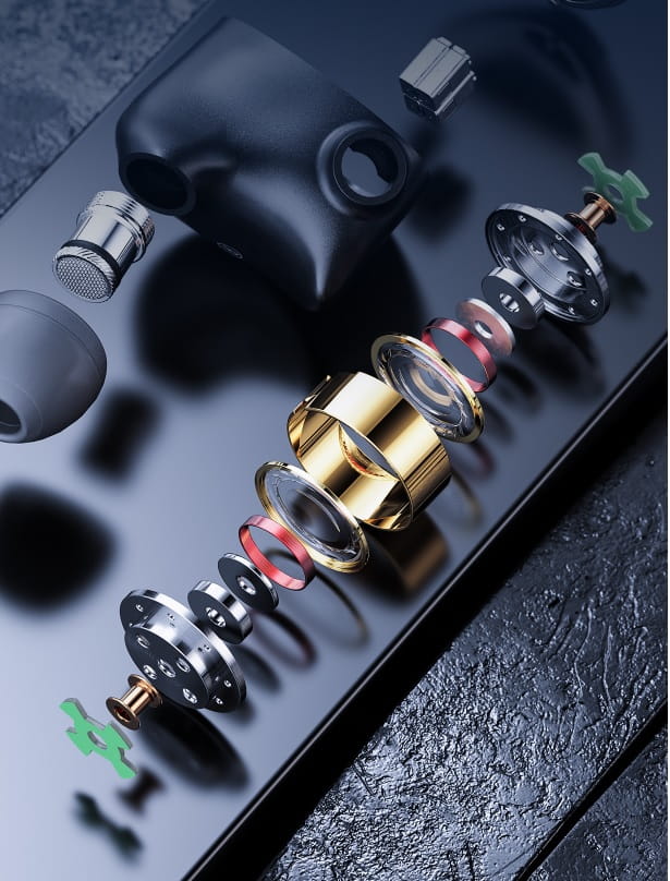 FIIO FH19 wykorzystuje sześć przetworników Knowles balanced armature jako jednostki dźwiękowe o średniej i wysokiej częstotliwości. Żeby osiągnąć jeszcze wyższy poziom jakości dźwięku wokali, FIIO współpracowało z Knowles, aby stworzyć niestandardowy zbalansowany przetwornik armaturowy ze wzmocnioną średnią częstotliwością. Dodając otwory akustyczne do tylnej wnęki przetwornika, przetwornik średniotonowy zyskuje więcej energii dźwięku w porównaniu do typowych przetworników średniotonowych. To jeszcze bardziej uwalnia wrodzone zalety tego przetwornika, co skutkuje bogatym i łagodnym wokalem, który jest przejmująco realistyczny. Poczujesz, jakby wokalista był tuż obok Ciebie.