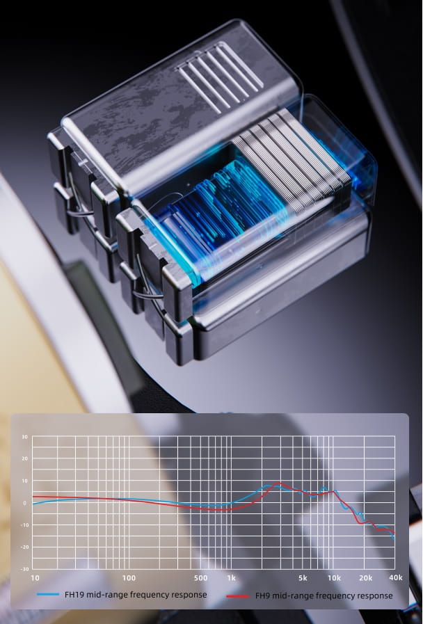 FH19 oferuje różnorodne przetworniki i zasady projektowania akustycznego. Naukowe dostrojenie każdej części tak, aby działały w harmonijnej całości, jest istotą strojenia na wysokim poziomie. Aby to osiągnąć, zespół inżynierów FIIO specjalnie zaprojektował filtr wycinający średnie częstotliwości dla hybrydowych słuchawek FH19.