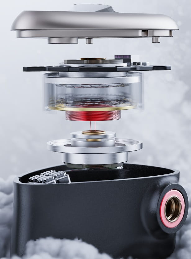 FIIO we współpracy z Tokyo Onkyo Co. Ltd. opracowało podwójną jednostkę przetworników dynamicznych push-pull* dla FH19, opartą na technologii push-pull stosowanej w high-endowym audio. Technologia ta wykorzystuje dwa 13,7 mm przetworniki dynamiczne o wysokiej magnetyczności z membranami kompozytowymi PU+DLC, rozmieszczone w przeciwstawnej konfiguracji. Gdy membrany poruszają się tam i z powrotem, ogólny kierunek ruchu dwóch przetworników dynamicznych pozostaje spójny, zapewniając spójność fazową. To skutecznie podwaja siłę napędową, a membrany mogą zapewniać wzajemne tłumienie powietrza. Dzięki temu przetworniki dynamiczne wykazują bardziej stabilny ruch i całkowicie tłumią wszelkie dźwięki resztkowe po zatrzymaniu sygnału audio.