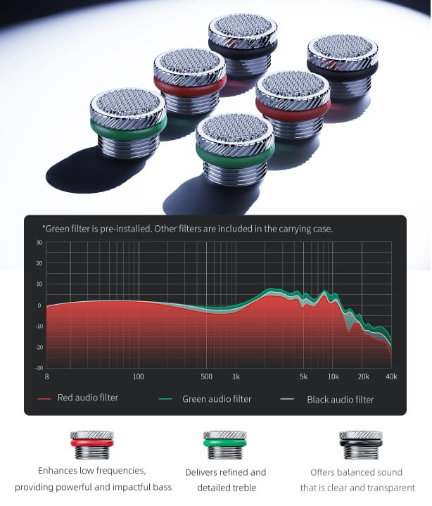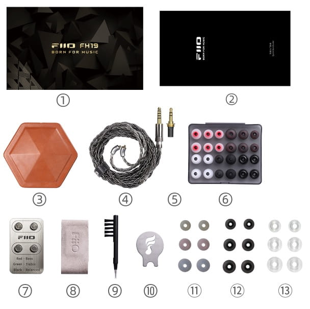 FH19, zgodnie ze swoim flagowym statusem IEM, jest wyposażony w trzy pary wymiennych filtrów audio. Każdy filtr ma inne tłumienie wewnętrzne i gęstość oczek, co pozwala dostosować dźwięk zgodnie z własnymi preferencjami.