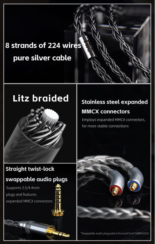 FH19 jest standardowo wyposażony w kabel z czystego srebra o wysokiej czystości. Każde z 8 pasm składa się z 28 przewodów, co daje łącznie 224 przewody. Każdy pojedynczy przewód jest izolowany emalią, a całość kabla jest spleciona we wzorze Litz. Zewnętrzna osłona jest wykonana z importowanego, przezroczystego, przyjaznego dla środowiska TPU, co dodatkowo poprawia jego wygląd. Ponadto materiał ten skutecznie zapobiega żółknięciu kabla podczas długotrwałego użytkowania i jego sztywnieniu w niskich temperaturach.