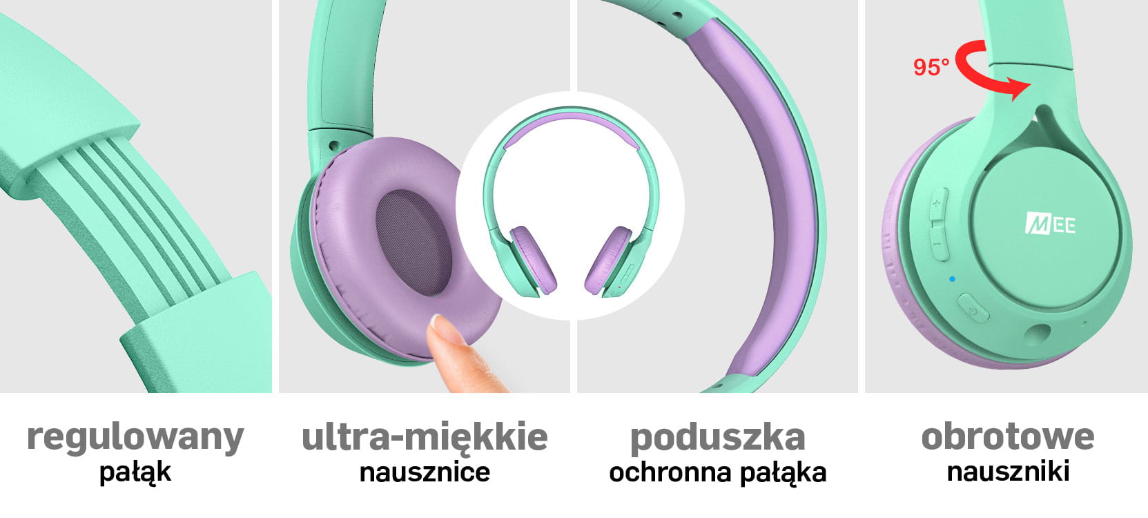 Mee Audio wychodzi z założenia, że najlepsze słuchawki dla dzieci to takie, z których dzieci będą chciały korzystać. Co lubią dzieci? Żywe kolory i wyraziste różnice między barwami, miękkość, lekkość i wolne od frustracji urządzenia. Z tego powodu słuchawki KidJamz KJ45BT oferowane są w trzech przyciągających wzrok kombinacjach kolorystycznych. Wyposażone są w miękkie nausznice i poduszkę ochronną pałąka, więc nie naciskają na głowę dziecka. Obrotowe elementy nauszne i regulowany pałąk umożliwiają łatwe dopasowanie słuchawek dla dziewczynek i chłopców od 4-go roku życia.