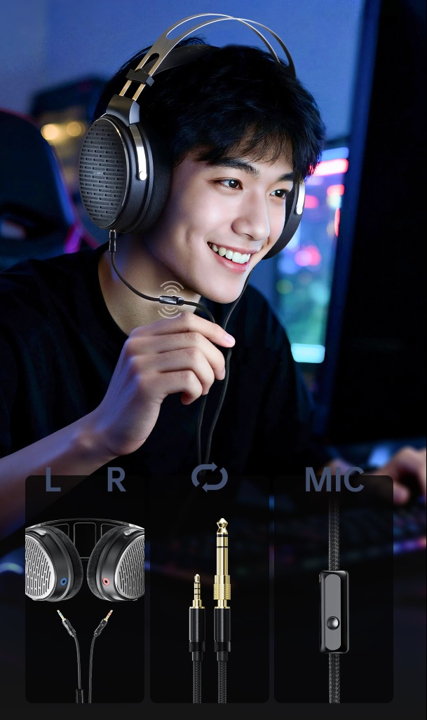 Kabel z miedzi beztlenowej pokrytej palladem posiada dwa złącza TRS oraz intuicyjne oznaczenia (lewy niebieski, prawy czerwony). Adapter 3,5 mm do 6,3 mm umożliwia podłączenie do różnych urządzeń. Odłączany kabel pozwala na wymianę i korzystanie z różnych źródeł dźwięku – zarówno z wyjściem niezbalansowanym, jak i zbalansowanym. Wbudowany mikrofon i sterowanie zwiększają funkcjonalność – od rozmów po rozgrywkę.