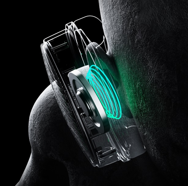 Przetworniki są ustawione pod kątem, by lepiej dopasować się do kształtu ucha. Poprawia to transmisję dźwięku i cyrkulację powietrza wewnątrz muszli, wpływając korzystnie na akustykę.