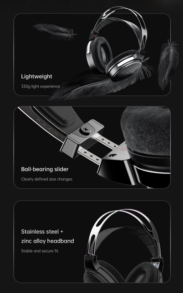 Słuchawki ważą zaledwie 330 g. Posiadają łożyska kulkowe do płynnej regulacji rozmiaru oraz pałąk ze stali nierdzewnej i stopu cynku, zapewniający stabilne i bezpieczne dopasowanie.