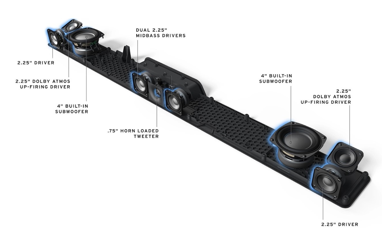 Wyposażony w dwa 2,25-calowe aluminiowe przetworniki, cztery przetworniki skierowane do przodu oraz dwa wbudowane 4-calowe subwoofery, Flexus Core 200 zapewnia głęboki, precyzyjny bas. Dodatkowy dedykowany głośnik centralny gwarantuje krystalicznie czyste dialogi, nawet przy niższej głośności.