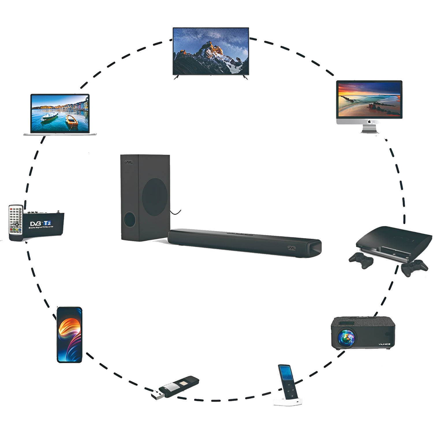 Mozos Theater wyposażony jest w kluczowe porty dla wygodnego podłączenia z twoimi urządzeniami domowymi jak laptop, telewizor, komputer, tablet itd. Dzięki wbudowanemu portowi HDMI ARC, możesz podłączyć swoje kino domowe do telewizora i obsługiwać system za pomocą oryginalnego pilota od TV. Złącze USB pozwoli ci odtwarzać muzykę bezpośrednio z Pendrive a interfejs Bluetooth 5.0 umożliwi bezprzewodowe transmitowanie muzyki z telefonu czy tabletu. Duża głośność zestawu w parze z mocnym basem z pewnością zadowolą nie tylko początkujących użytkowników.