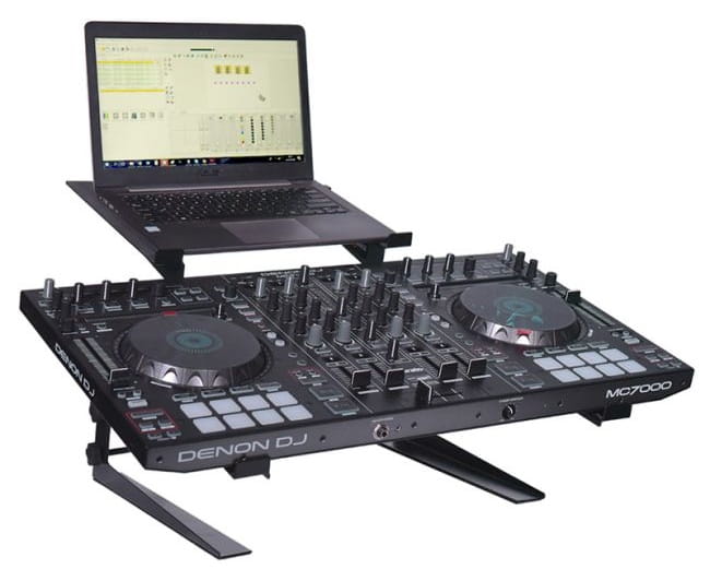 - wysokiej jakości, profesjonalny i stabilny statyw pod laptop dla DJ-a, na którym możemy postawić także mikser, kontroler, efekt lub inne urządzenie