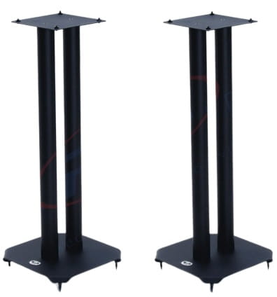 Dwa stojaki głośnikowe BT606 z serii Atlas z zakrzywionymi rogami dolnej podstawy, pozwalające wyważyć pozycję stojaka za pomocą regulowanych kolców, izolujących od rezonansów. W zestawie również alternatywne podkładki piankowe, zamiast kolców.