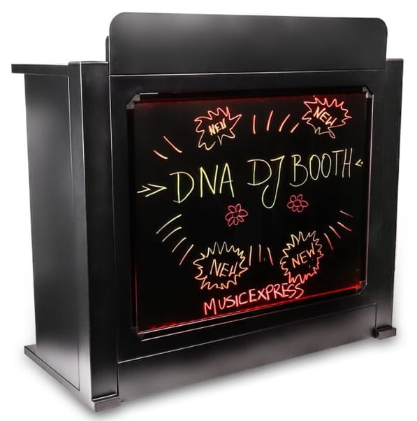 DNA DJ BOOTH to stabilna, metalowa konstrukcja w kolorze czarnym, wyposażona w specjalną, podświetlaną tablicę, na której możemy rysować dowolne kształty i napisy za pomocą dołączonych do zestawu długopisów fluorescencyjnych. Ważną częścią jest również położony na wysokości 93 cm, duży, zdejmowalny blat o wymiarach 99 x 49,5 cm. Jest to świetny sposób na zmieszczenie na jednej, kompaktowej przestrzeni miksera wraz z dodatkami, laptopa i innych akcesoriów. Przez to, DNA DJ BOOTH to świetne rozwiązanie dla każdego, kto podczas swoich występów wykorzystuje różnego rodzaju miksery DJ, odtwarzacze, loopery, efekty audio, a nawet syntezatory i klawiatury sterujące. W blacie znajdziemy specjalny otwór na kable, który pozwala na ich wygodne umieszczenie, zapobiegając ich splątaniu. Dodatkowo, w zestawie jest również dedykowany pokrowiec wykonany z najlepszej jakości materiału, ułatwiający wygodny transport i przechowywanie ✅.