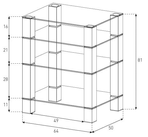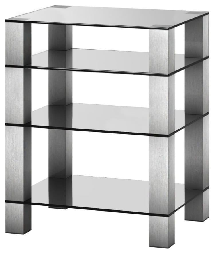 Sonorous RX5040 to stolik HI-FI z czterema pólkami, konstrukcja wykonana z wysokiej jakości aluminium o kształtach kwadratowych, półki wykonane z hartowanego szkła z polerowanymi krawędziami o szerokości 64 cm. Stolik wyposażony w kółka.