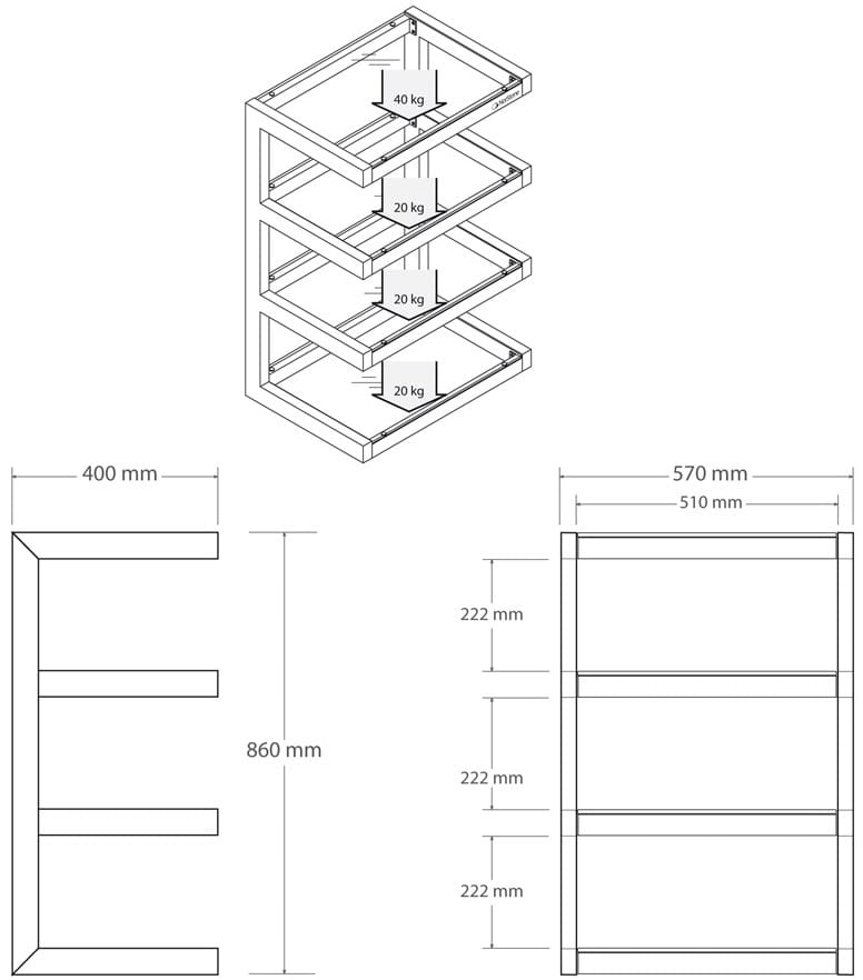 | Półka A | Wymiary (Sz x Gł): 510 x 400 mm Grubość półki: 6 mm Maksymalne obciążenie: 40 kg |