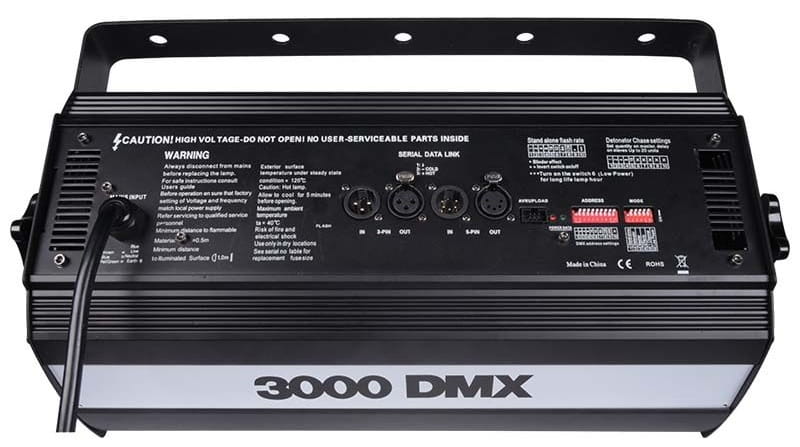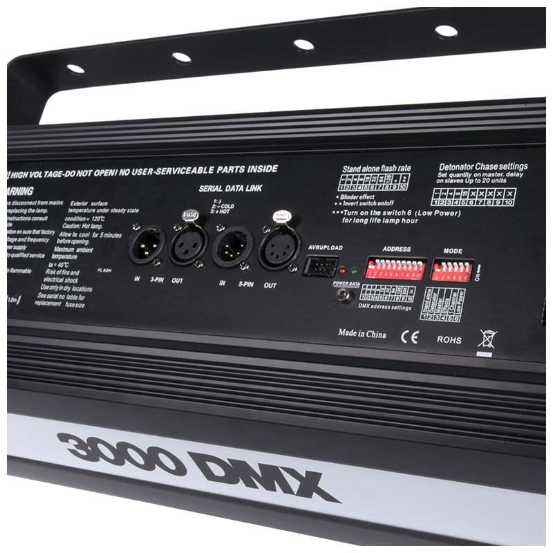 Stroboskop Light4Me Strobe 3000W posiada solidną, metalową obudowę odporną na wysokie temperatury powstające w wyniku pracy lampy błyskowej, co gwarantuje duże bezpieczeństwo podczas użytkowania reflektora. Łatwość obsługi zapewniają 3- oraz 5-stykowe złącza XLR pozwalające na sterowanie pracą palnika stroboskopowego za pomocą protokołu DMX, a także wygodne w użyciu przełączniki dip-switch pozwalające na manualne sterowanie jednostką, jej adresowanie i wybór trybu pracy. W trybie DMX do dyspozycji mamy 3 lub 4 kanały odpowiedzialne m.in. za częstotliwość fleszowania i czas trwania pojedynczego błysku. Dzięki temu z łatwością stworzymy efekt klatkowania obrazu w dyskotece albo na techno-party lub burzowe błyski w teatrze albo na planie filmowy (funkcja Random). Możliwości programowalne reflektora rozwija dodatkowo 6-stykowe złącze AVR.