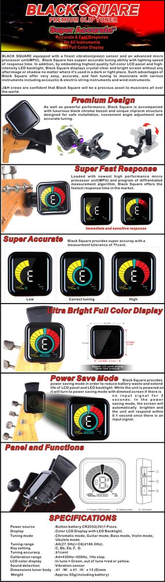Stroik tuner do gitary ukulele skrzypiec na klips - J&H Technology Black Square | RATY | SALA ODSŁUCHOWA POZNAŃ