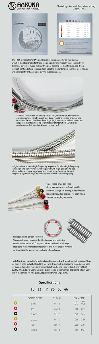 Struny HAKUNA posiadają kolorowe mosiężne końcówki, które nie tylko dobrze wyglądają, ale są również odporne na rdzę i są trwałe. Różne struny są oznaczone kolorami, co eliminuje potrzebę indywidualnego pakowania każdej struny, zmniejszając zużycie materiałów do pakowania.