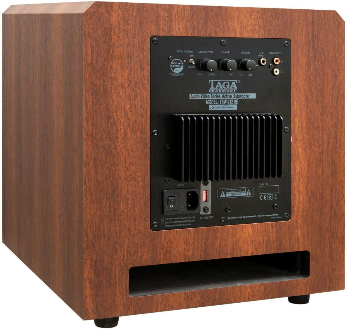 TSW-212 SE to aktywny subwoofer z pojedyńczym 12” przetwornikiem niskotonowym oraz wbudowanym wysoko-prądowym wzmacniaczem i tylnym, szczelinowym portem bassreflex. Wzmacniacz dostarcza 240 watów mocy i charakteryzuje się wysoką wydajnością prądową co odzwierciedla się niższymi zniekształceniami, bardziej płaskim i wyrównanym pasmem przenoszenia i o wiele szybszą reakcją wzmacniacza oraz zredukowanymi szumami pracy. Wbudowany ogranicznik zniekształceń pozwala na osiągnięcie najlepszych osiągów i bezpieczeństwa pracy wzmacniacza i przetwornika przy ekstremalnie wysokich poziomach głośności.