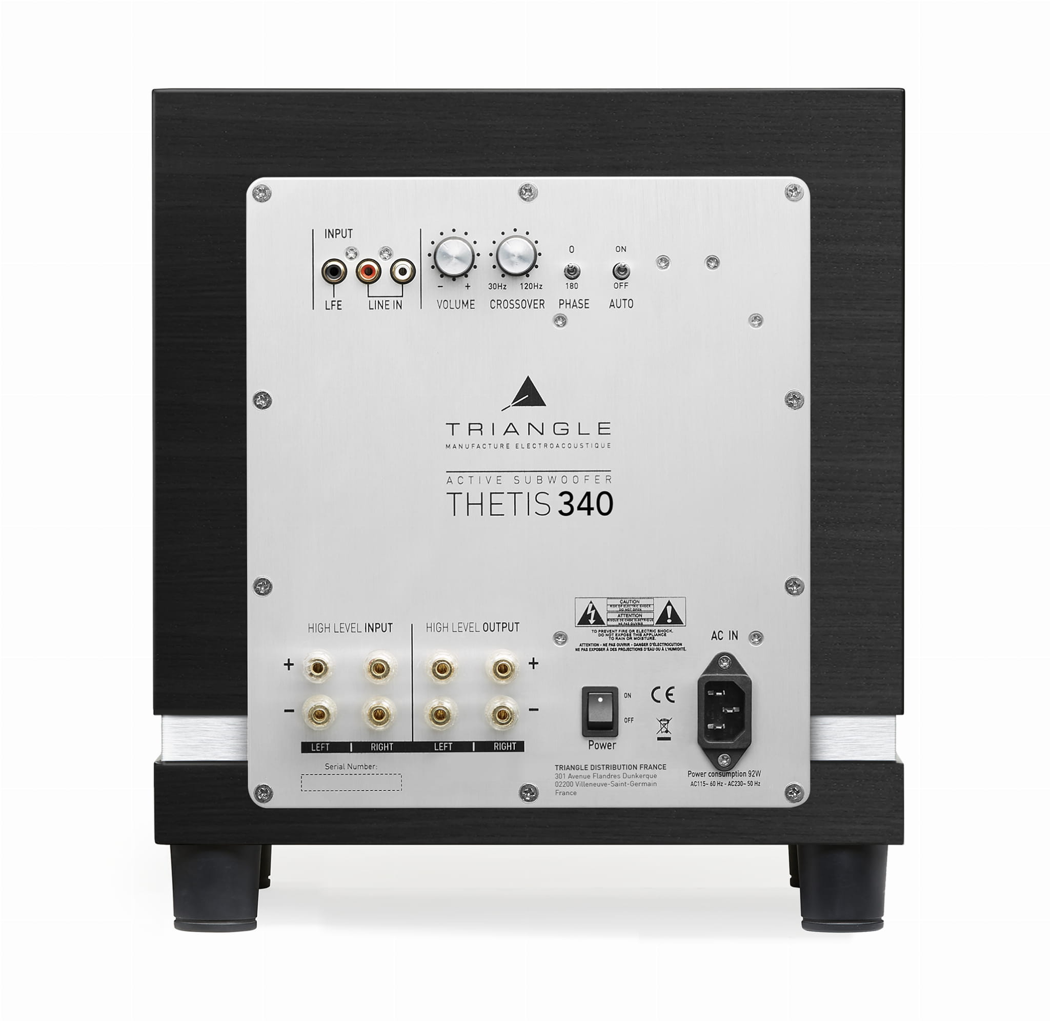 Na tylnym panelu urządzenia znajdują się liczne wejścia, które umożliwiają podłączenie subwoofera do różnych rodzajów wzmacniaczy. Seria Thetis oferuje wejście LFE służące do podłączenie np. amplitunera kina domowego, jak również wejścia wysokiego poziomu (głośnikowe) dla wzmacniaczy pozbawionych tradycyjnego wyjścia „subwoofer”. Dwa pokrętła pozwalają na manualne dostosowanie głośności oraz odcięcia na zwrotnicy w zakresie 30 – 120 Hz, aby idealnie zbalansować cały system. Dzięki możliwości ustawienia częstotliwości odcięcia ze stromym nachyleniem zbocza, subwoofer można bardzo łatwo dopasować do częstotliwości granicznych w głośnikach głównych. Co więcej, urządzenie zapewnia funkcję kontroli fazy w trzech poziomach 0, 90 i 180 stopni, oraz automatyczny standby po 20 minutach braku sygnału.