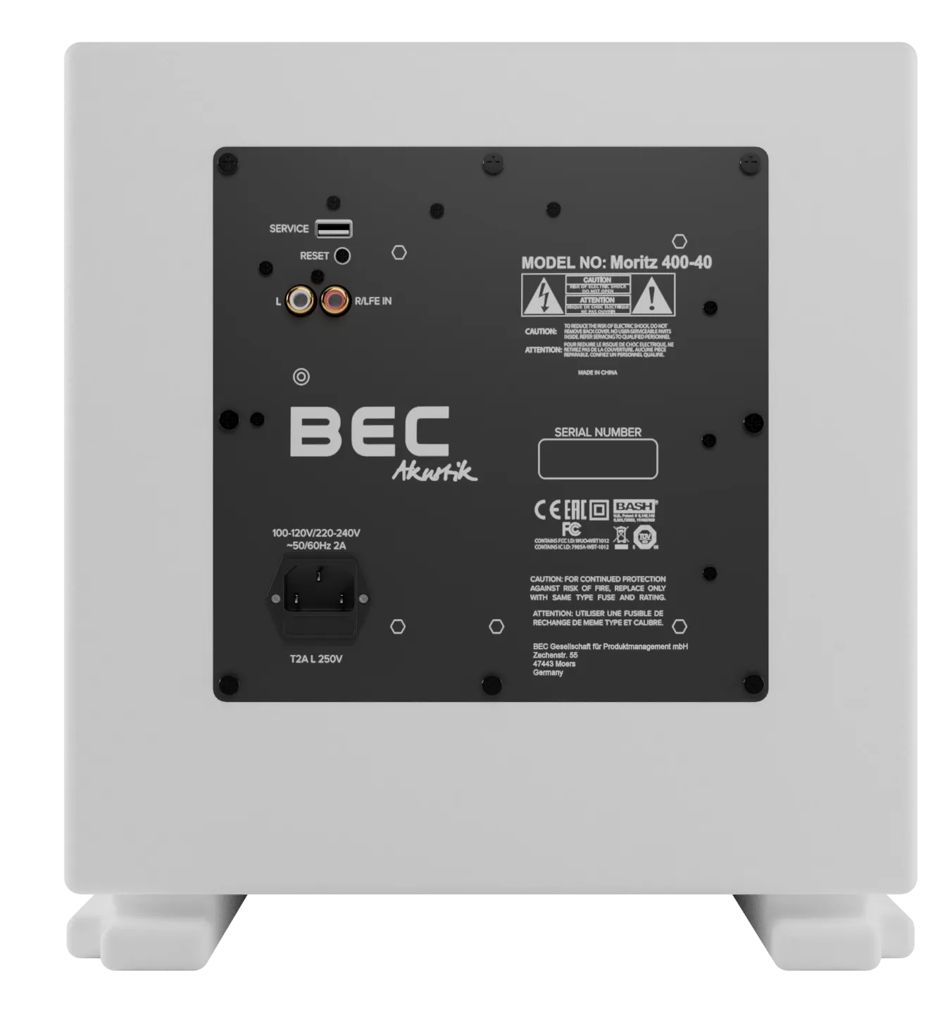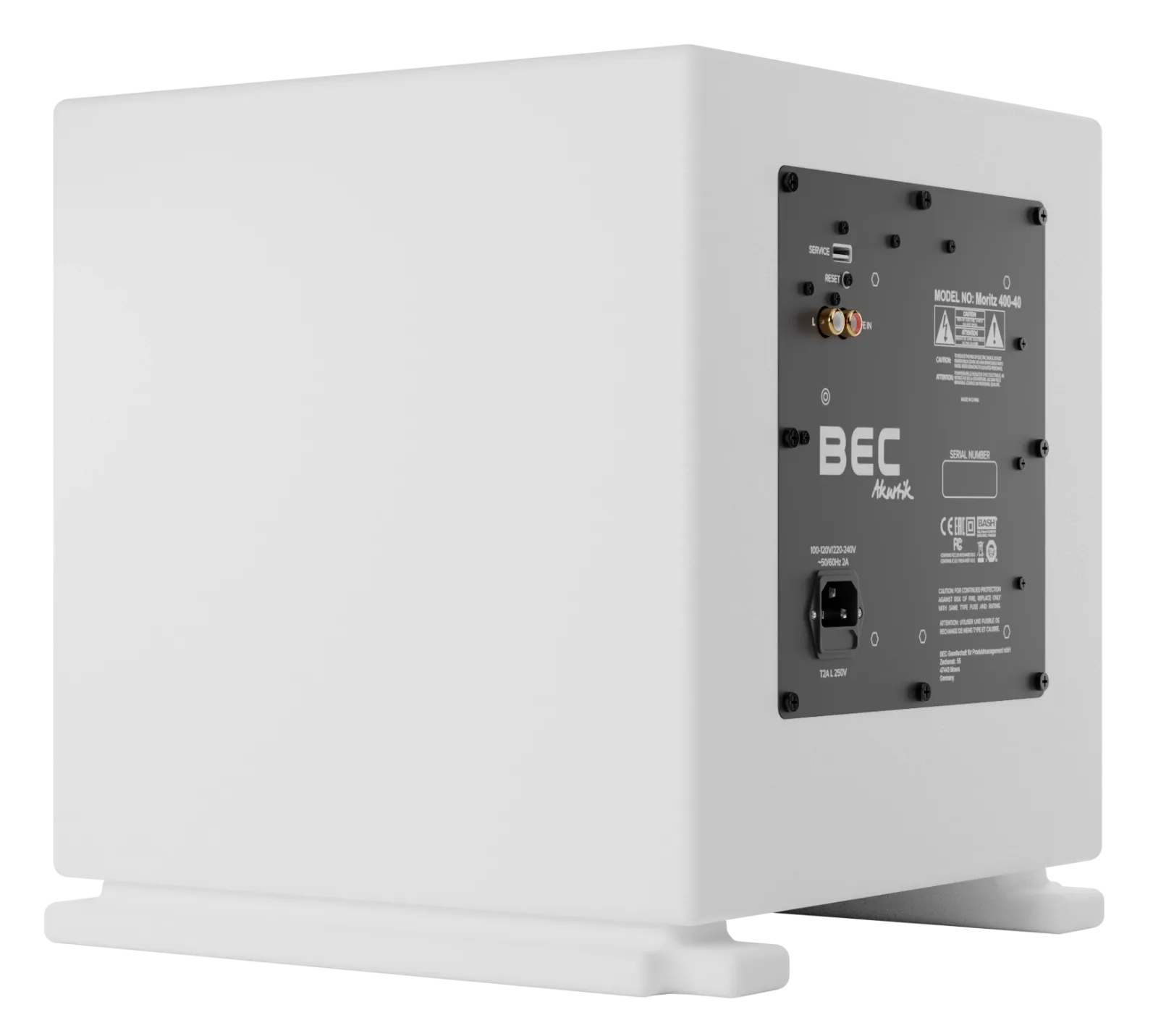 BEC Akustik Moritz 400-40 to subwoofer aktywny z głośnikiem 10″, 10-calową pasywną membraną (przetwornik pasywny) i wbudowanym wzmacniaczem mocy + DSP.