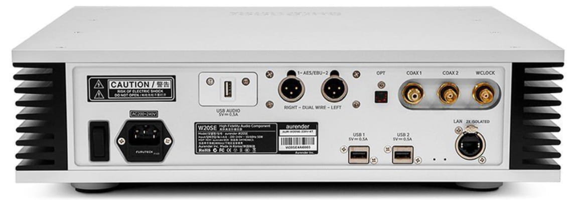 Zaprojektowany do współpracy z najlepszymi przetwornikami cyfrowo-analogowymi na świecie, Aurener W20SE wyposażony jest w szeroki wachlarz wyjść cyfrowych [Dual AES/EBU, S/PDIF – BNC i optyczne] oraz jedno dedykowane wyjście USB Audio 2.0. Do połączeń z siecią i przesyłu danych służy gigabitowy port Ethernet i dwa porty USB 2.0.