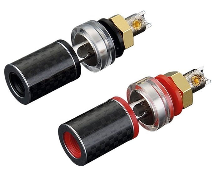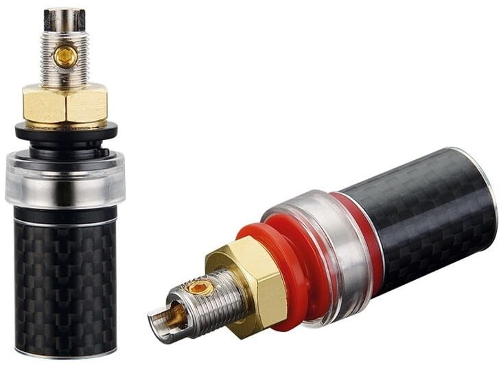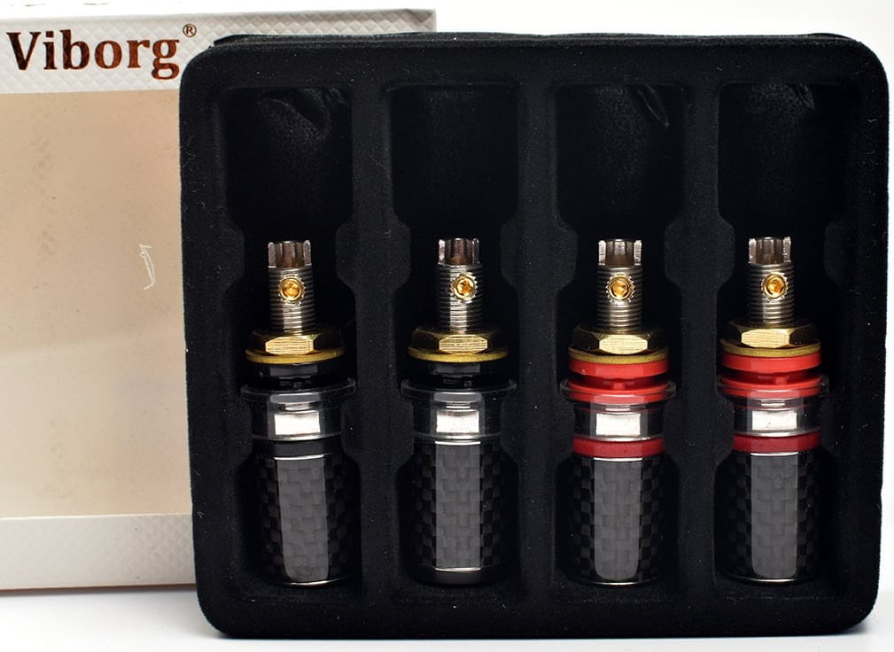 Najwyższej jakości termianale głośnikowe Viborg BP604R. Elementy stykowe wykonane z czystej miedzi pokryte warstwą rodu.