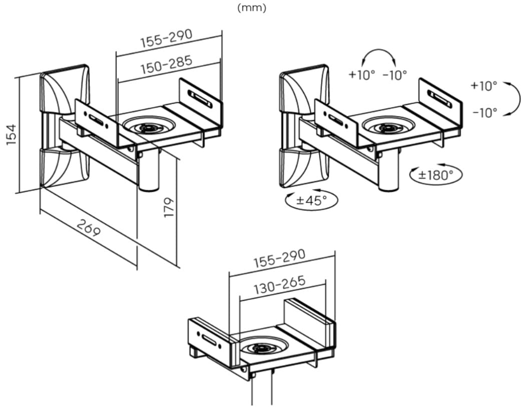 | Ramię | Długość całkowita (od ściany, całkowicie rozciągnięte): 26.9 cm Zakres obrotu*: +45°~-45°. * Regulowane |