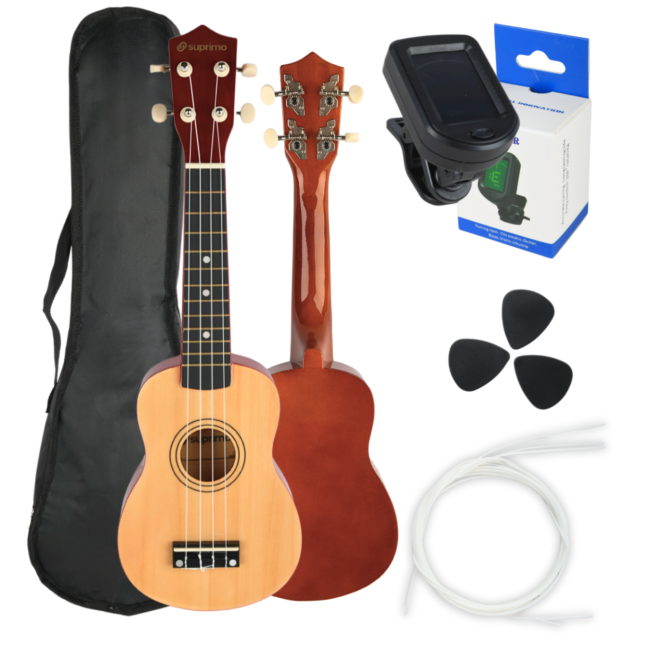 Ukulele sopranowe 21" naturalne drewno pokrowiec 3 kostki do gry zapasowe struny tuner zestaw dla dzieci do nauki gry - SUPRIMO UK21 SET NW | RATY | SALA ODSŁUCHOWA POZNAŃ