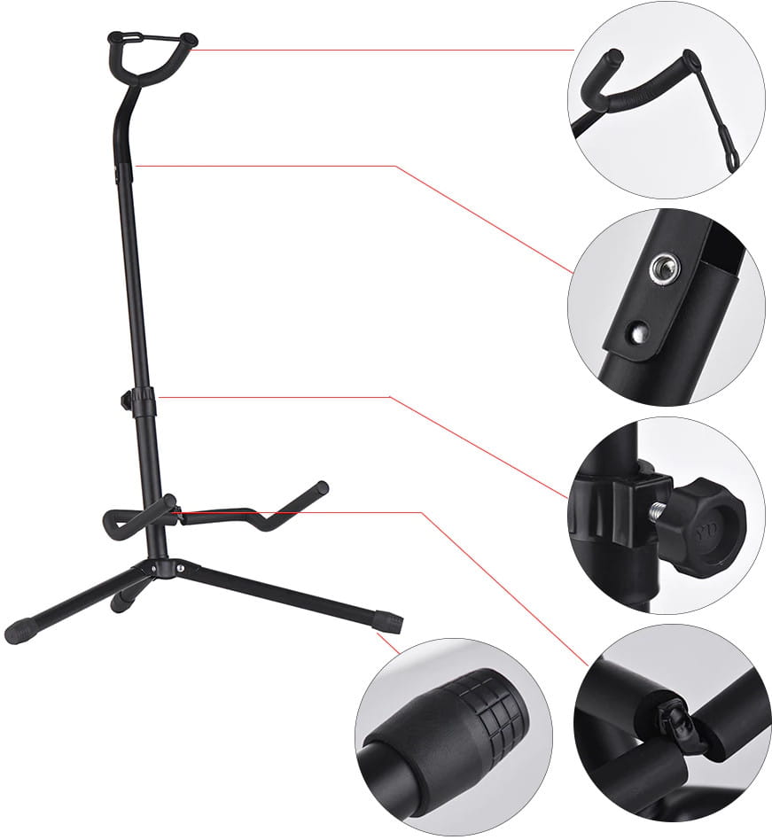 Oferujemy państwu uniwersalny, solidnie wykonany stojak na gitarę z regulacją wysokości. Statyw gitarowy naszej marki umożliwi bezpieczne i wygodne przechowywanie instrumentów różnych typów i wielkości w szczególności gitar. Każdemu muzykowi ceniącemu swój instrument polecamy zakup takiego statywu. Stojak ten sprawdzi się do przechowywania wszelkich typów gitar akustycznych, klasycznych, elektrycznych czy też basowych.