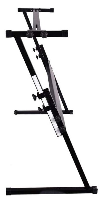 Suprimo F to solidny i bardzo wygodny statyw klawiszowy pod keyboard, pianino cyfrowe lub syntezator dźwięku, który po dołożeniu blatu może również funkcjonować jako stół DJ-ski. Stojak w całości wykonany został ze stalowych profilów pomalowanych proszkowo na kolor czarny, dzięki czemu jest odporny na zarysowania i rdzę. Posiada regulację wysokości w zakresie od 49 do niemal 80 cm. Pozwala to na wygodną grę zarówno w pozycji siedzącej i stojącej. Solidne wsporniki na instrument ze wzmacniającą poprzeczką posiadają na końcach antypoślizgowe nakładki, dzięki którym klawisze pewnie trzymają się na swoim miejscu. Głębokie podstawy na gumowych nóżkach zapewniają dużą stabilność całej konstrukcji i zapobiegają jej przesuwaniu się po podłożu. Zastanawiając się, jaki statyw pod klawisze wybrać, warto zwrócić uwagę na ten model. To doskonałe rozwiązanie zarówno dla amatorów i zawodowych muzyków. Doskonale sprawdza się w warunkach domowych, na salach prób, a także podczas koncertów, wesel i różnego typu imprez okolicznościowych.