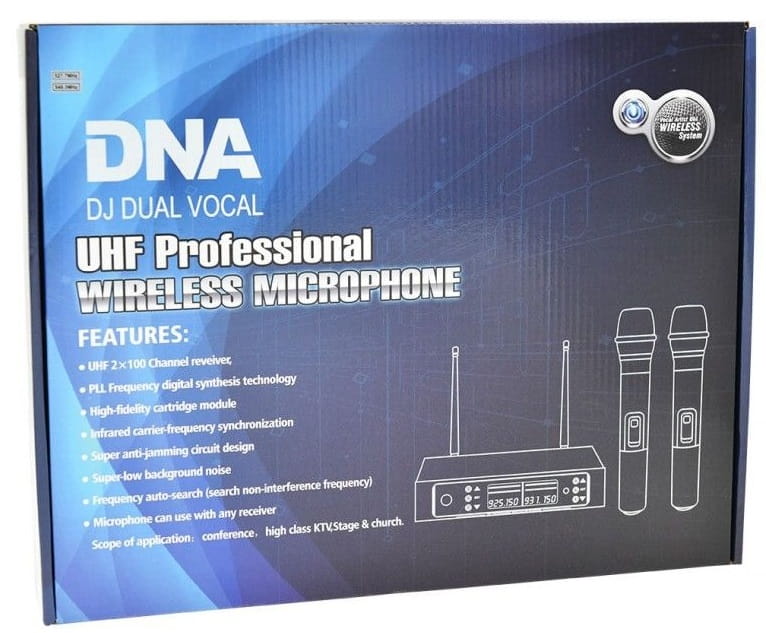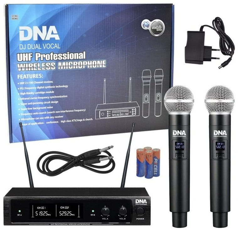 DNA DJ DUAL VOCAL to wysokiej klasy bezprzewodowy system mikrofonowy, w którego skład wchodzą dwa dynamiczne mikrofony doręczne oraz odbiornik fal radiowych UHF. Zestaw idealnie sprawdza się jako nagłośnienie dla zespołu weselnego, DJ-ów, firm eventowych, animatorów gier i zabaw, karaoke, a także różnego typu instytucji kulturalnych i oświatowych. Każdy z mikrofonów wokalnych zasilany jest dwoma 1,5-woltowymi bateriami typu AA, które pozwalają mu na nieprzerwaną pracę przez niemal 8 godzin. Nadajnik posiada wygodny przełącznik zasilania oraz wyświetlacz LCD, na którym wyświetlana jest częstotliwość pracy oraz stan naładowania baterii. Kardioidalna charakterystyka kierunkowości sprawia, że ilość dźwięków zbierana przez mikrofon z otoczenia jest minimalna. Dodatkowo idealnie dopasowane pasmo przenoszenia sprawia, że mikrofon wokalny doskonale spełnia swoja rolę.