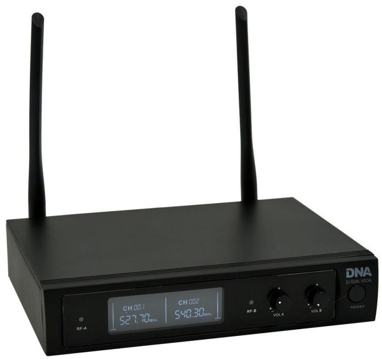 Odbiornik wyposażony został w dwie anteny o dużej czułości. Na przednim panelu mieszczą się przełącznik zasilania, potencjometry głośności mikrofonów oraz czytelny wyświetlacz LCD pokazujący parametry pracy systemu. Z tyłu znajdują się gniazdo zasilania, dwa wyjścia XLR dla kanałów A i B, oraz wyjście jack 6,3 mm. DNA DJ DUAL VOCAL to idealny zestaw mikrofonowy dla DJ-ów, zespołów muzycznych, wokalistów śpiewających solo lub w duecie, a także osób i firm organizujących panele dyskusyjne, szkolenia i różnego typu spotkania tematyczne. To również świetne bezprzewodowe mikrofony do karaoke.