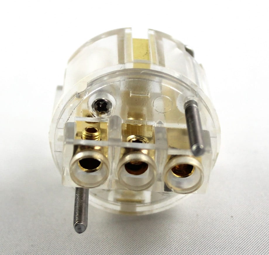Złącze wykonane z mosiądzu pokrytego złotem. Obudowa przeźroczysta z naklejanym oznakowaniem marki.