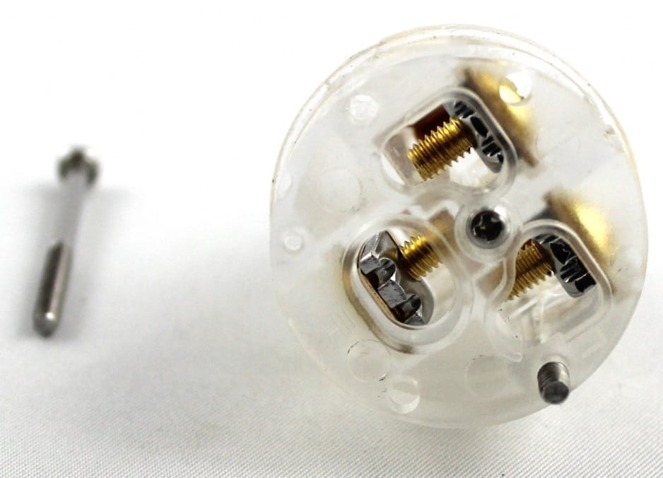 Złącze wykonane z mosiądzu pokrytego srebrem. Obudowa przeźroczysta z naklejanym oznakowaniem marki.