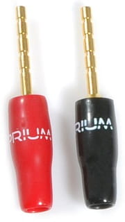 Solidnie wykonany metalowy wtyk głośnikowy typu szpilka ze zdejmowaną, elastyczną, plastikową osłonką z kolorowym oznaczeniem kanału (czarny / czerwony).