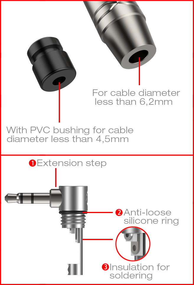 - Cechy - Wytrzymała obudowa ze stopu cynku z wygrawerowanym logo ROXTONE. Smukły wtyk 1/8” ułatwiający użytkowanie. Tuleja PVC zapewnia doskonałą ochronę kabla. Stosować do kabli o średnicy mniejszej niż 6,2 mm. Chronione patentem. Dodatkowy pierścień zapobiegający luzowaniu