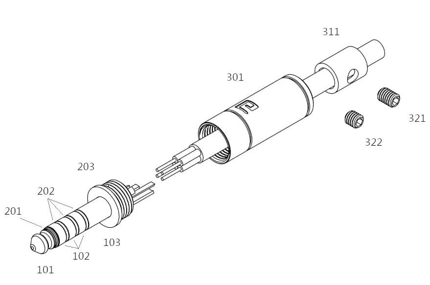 - w przypadku kabli o średnicy do 4,5 mm można wykorzystać redukcję (element 311), którą należy wcześniej nałożyć na kabel wraz z obudową. Nie pasuje ona do kabli o większej średnicy (do 6,5 mm), w przypadku których należy nałożyć samą obudowę wtyku (301);