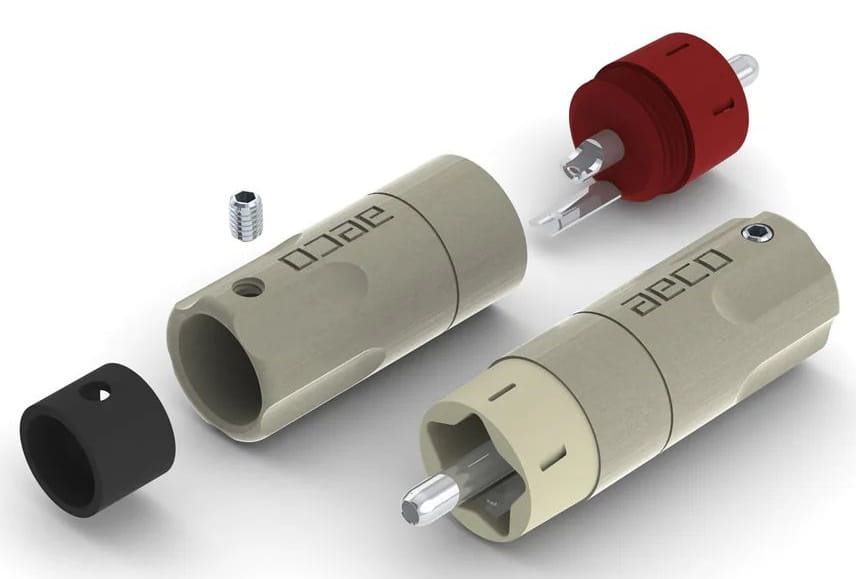 Obudowa wtyku, która jest nakręcana na korpus, została wykonana z mosiądzu. Materiał ten został poddany szczotkowaniu, niklowaniu i dodatkowemu powlekaniu w celu osiągnięcia pięknej, satynowej powierzchni, na której wygrawerowano logotyp marki aeco. Redukcja jest przygotowana ze specjalnego tworzywa POM i mocowana żelazną śrubką.