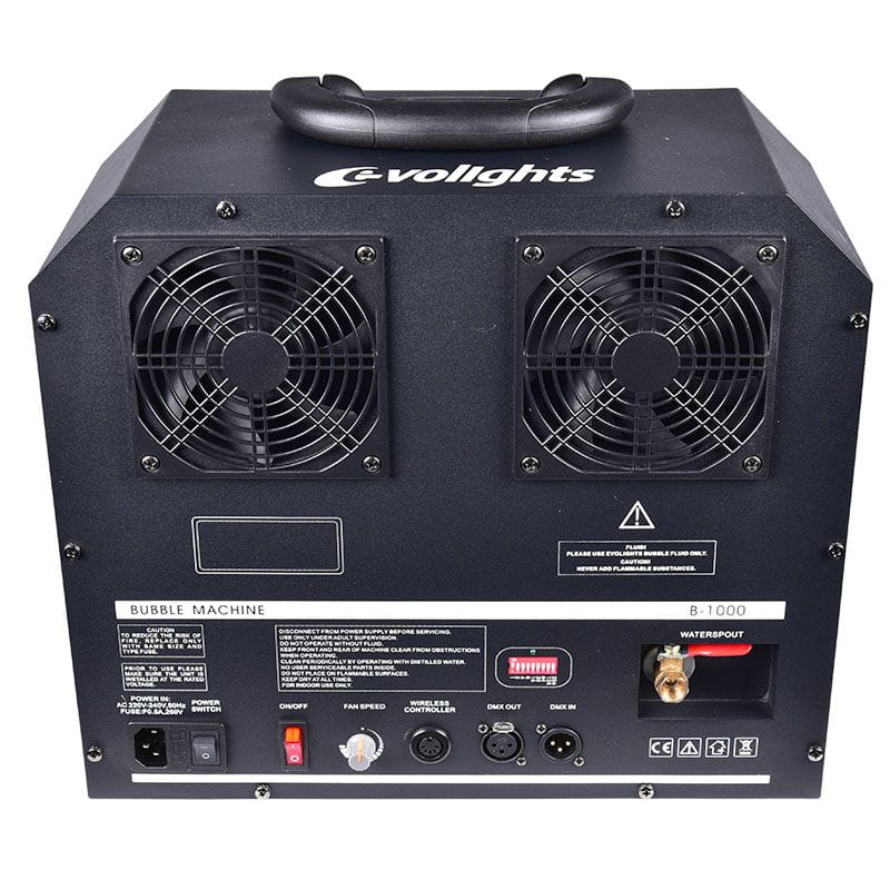 Urządzenie może być obsługiwane ręcznie, za pomocą bezprzewodowego pilota lub przy wykorzystaniu protokołu DMX. Wytwornica baniek Evolights B1000 wyposażona została w dwa obrotowe generatory baniek oraz duży pojemnik na płyn, którego 1 litr wystarcza na ponad 100 minut nieprzerwanej pracy. Nadmiar płynu spływa do specjalnego pojemnika, który po skończonej pracy może zostać umyty i opróżniony za pomocą wygodnego zaworu. Ruch obrotowy silnika przekładany jest na generatory za pomocą specjalnych pasków napędowych, dlatego ruchome elementy są w pełni bezpieczne, a to bardzo ważne, szczególnie w przypadku dzieci. Dzięki czterem silnym dmuchawom bańki mydlane są w stanie unosić się na znaczną wysokość bez względu na to, czy generowane są w pomieszczeniach, czy na dworze podczas bezwietrznych dni.