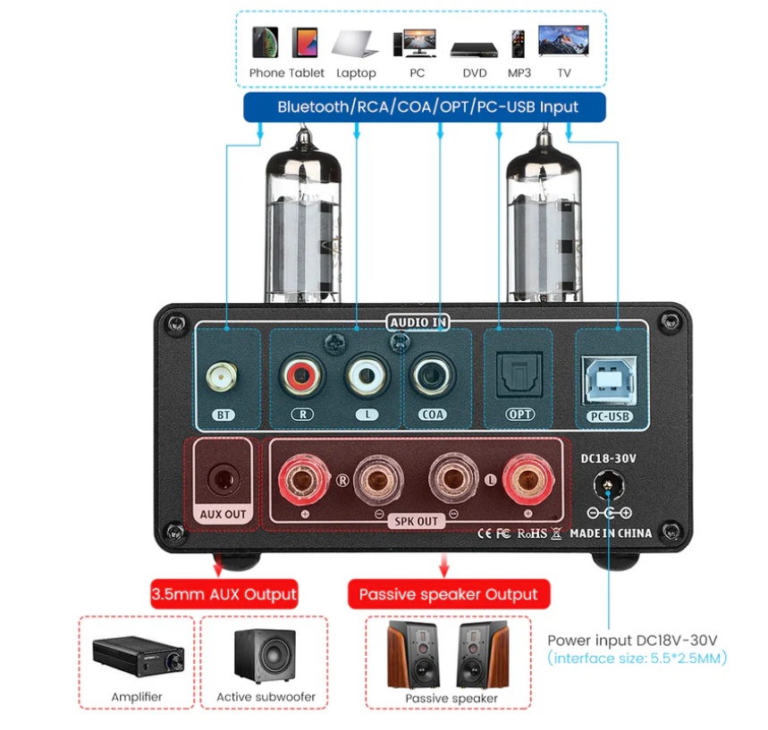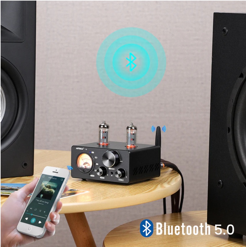 Wzmacniacz posiada wbudowany przetwornik DAC umożliwiający podłączenie wielu różnych urządzeń w tym PC lub laptopa. Dodatkowo możliwość podpięcia subwoofera. T9 wyposażony jest w łączność bezprzewodową Bluetooth 5.0
