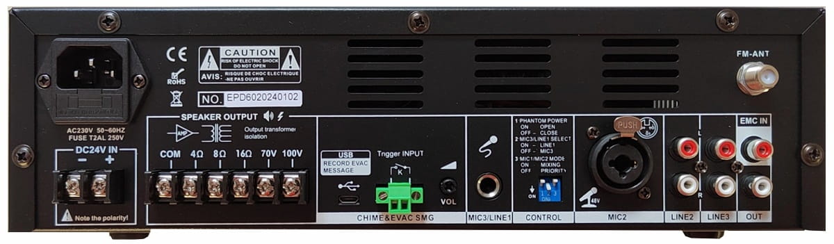 | Wyjścia | RCA, głośnikowe: 100V lub 70V & 4 Ohm / 8 Ohm / 16 Ohm |