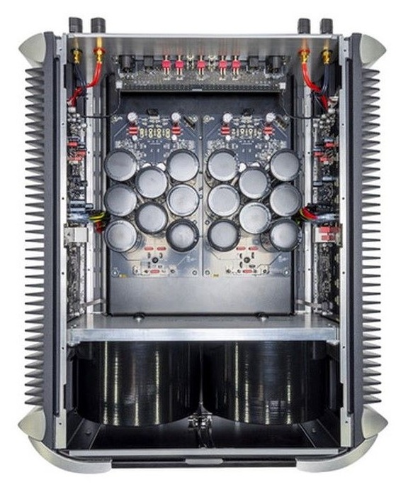 Potężny wzmacniacz o potencjale dynamicznym dwóch transformatorów 1500 VA i pojemności 228000 uF, który bez trudu generuje 300 W na kanał.