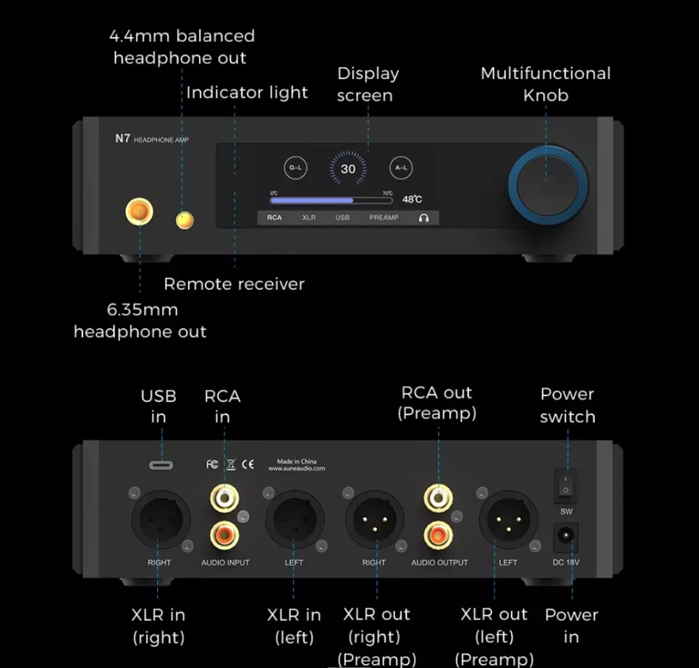 aune audio N7 wyposażony jest w dwa wyjścia słuchawkowe (6,35 mm i 4,4 mm), dwa liniowe wejścia audio (RCA i XLR) oraz dwa wyjścia przedwzmacniacza (RCA i XLR). Dzięki temu świetnie sprawdza się zarówno jako wzmacniacz słuchawkowy, jak i przedwzmacniacz do wzmacniaczy mocy czy aktywnych głośników. N7 to wszechstronne urządzenie, które sprawdzi się w wielu domowych systemach audio.