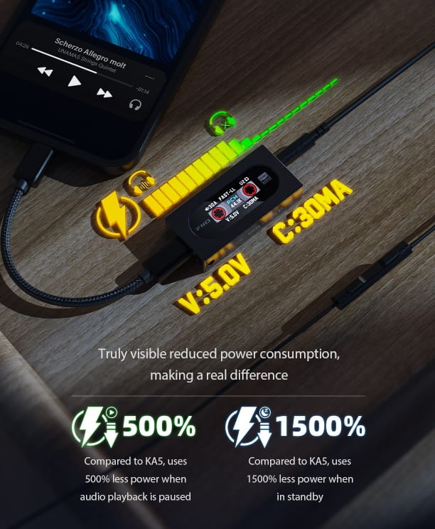 Wyposażony w wydajny, energooszczędny procesor i precyzyjne układy scalone, KA15 oferuje innowacyjne monitorowanie napięcia i prądu w czasie rzeczywistym w celu dynamicznej regulacji mocy. Rozpoznając stan odtwarzania urządzenia, inteligentnie dostosowuje ogólne zużycie energii, dzięki czemu Twój telefon działa przy mniejszym poborze prądu. Gdy ustawisz timer odtwarzania muzyki w nocy, po zakończeniu odliczania KA15 przejdzie w tryb uśpienia o bardzo niskim zużyciu energii — dzięki czemu nie musisz się martwić, że bateria telefonu będzie słaba, gdy obudzisz się następnego dnia.