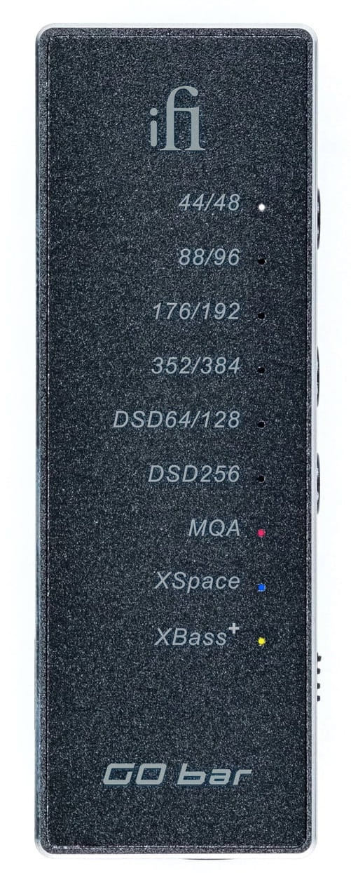 Większość przenośnych DAC/AMP-ów USB zapewnia niewielką kontrolę głośności lub jej brak, a głośność można regulować tylko za pomocą urządzenia źródłowego. GO Bar jest inny, jego inteligentna aluminiowa obudowa ma fizyczne przyciski do precyzyjnej regulacji głośności. Kolumna kolorowych diod LED zapewnia informacje o formacie i częstotliwości próbkowania aktualnie odtwarzanego formatu oraz czy włączone są XBass+ i/lub XSpace.