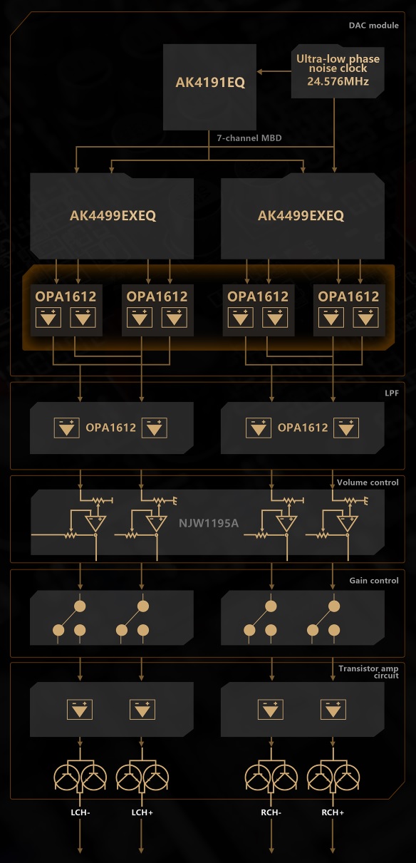 Od przetwornika cyfrowo-analogowego, przez konwersję I/V, filtrowanie dolnoprzepustowe, aż po wzmacniacz słuchawkowy, cały obwód audio ma architekturę całkowicie różnicową. Zapewnia to zarówno wysokie zakresy dynamiki sygnałów, jak i znacznie zmniejszone przesłuchy. Różne części obwodu audio, w tym konwersja I/V i stopnie LPF, wykorzystują wiele precyzyjnych wzmacniaczy operacyjnych OPA1612 o niskim poziomie szumów, aby zapewnić dynamiczne wyjście sygnału audio.