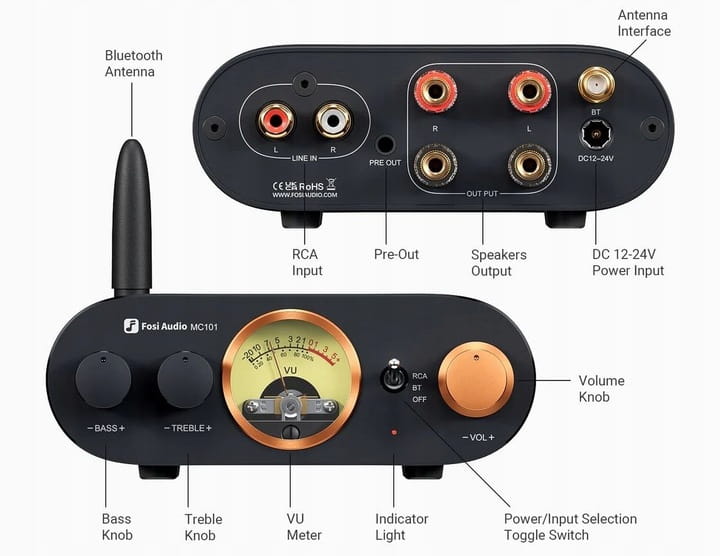 Fosi Audio MC101 to wzmacniacz o eleganckim, klasycznym wzornictwie, przykuwający wzrok złotym pokrętłem i VU metrem (wskaźnikiem wysterowania), które są stylowo wkomponowane w przedni panel i wyróżniają się na tle czarnej, matowej powierzchni. Dzięki temu spodoba on się fanom stylu vintage i będzie idealnym dopełnieniem wielu salonowych systemów audio. Obudowa MC101 została dodatkowo w całości wykonana z odpornego stopu aluminium, co gwarantuje długą żywotność.