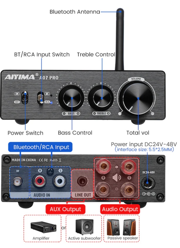 AIYIMA A07 PRO wzmacniacz zintegrowany o niewielkich rozmiarach w wydajnej klasie D. Proponowana moc wzmacniacza wystarczy dla melomanów i dla wysterowania podstawowych i średnich zestawów audio. Dodatkowo w odróżnieniu od podstawowej wersji wyposażony w Bluetooth 5,2 dzięki czemu mamy możliwość podłączenia źródeł bezprzewodowych.