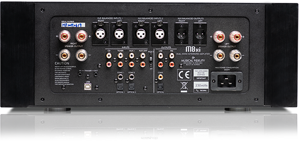 - M8xi jest oddzielnym przedwzmacniaczem z dwoma monoblokowymi końcówkami mocy dzielącymi wspólną obudowę